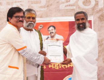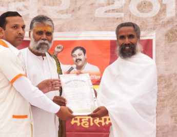 संत गोपालदास जी एवं सूर्य योगी से एम् डी (पंचगव्य) प्रमाण पत्र ग्रहण करते हुए.
